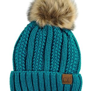 C.C Thick Cable Knit Faux Fuzzy Fur Pom Fleece Lined Skull Cap Cuff Beanie, Teal