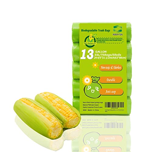 Trash Bags 13 Gallon Tall Kitchen Garbage Bags, Inwaysin Recycle Bags, Biodegradable Trash Bags, 75 Bags, Green