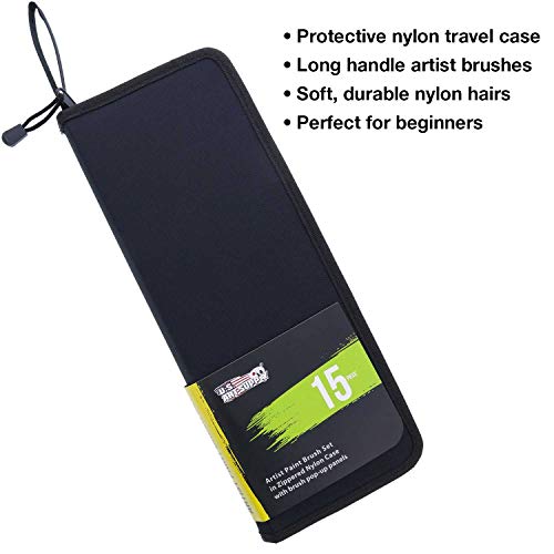 U.S. Art Supply 15 Piece Artist Long Handle Synthetic Paint Brush Set – Multi Functional Watercolor Gouache Oil Acrylic Brush Set in Zippered Nylon Pop-Up Travel Storage Case